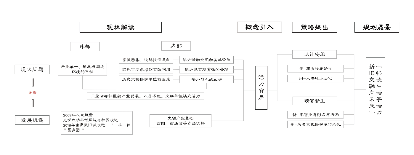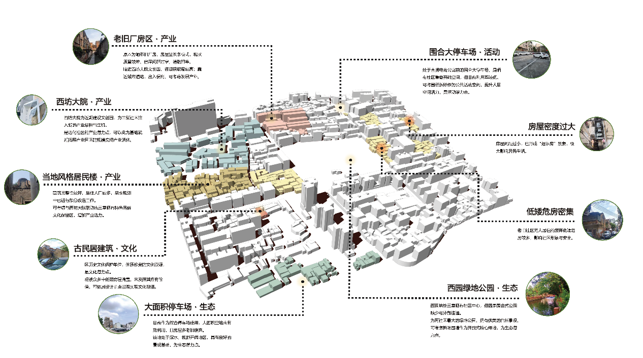 作品简介:基于有机更新的规划理念,依托社区现有文化创意产业和历史文脉,将社区划分成西园核心区、文创民俗风情区、宜居生活区,形成“两轴一心一带”发展格局,建立“服务设施”、“人居环境”、“业态丰富”、“历史活化”四个方面的社区活力体系,以实现社区的整体更新。