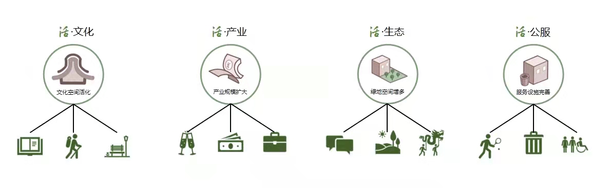 使老旧社区重现活力,需注重多方面共同改造,实现社区由内在机制发展与外在形象的共同活化,使从儿童到老年人各年龄段的市民都能得到富有活力的生活,于是有了活文化、活产业、活生态、活公服四个主要规划设计部分。