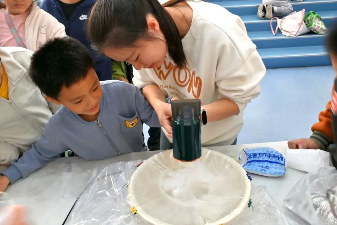 接下来到了最令人屏息凝神的台风模拟实验,志愿者先向盆中倒入热水制造水汽,再投放干冰形成缭绕烟雾,当启动吹风机制造定向气流后,盆中烟雾瞬间呈螺旋状升腾,一个微型 “台风” 成功成型,清晰的 “台风眼” 让孩子们惊叹不已。在志愿者的指导下,孩子们还亲自参与实验操作,近距离观察气流旋转的动态过程,将抽象的气象原理转化为可触可感的科学体验,深刻理解了台风的形成机