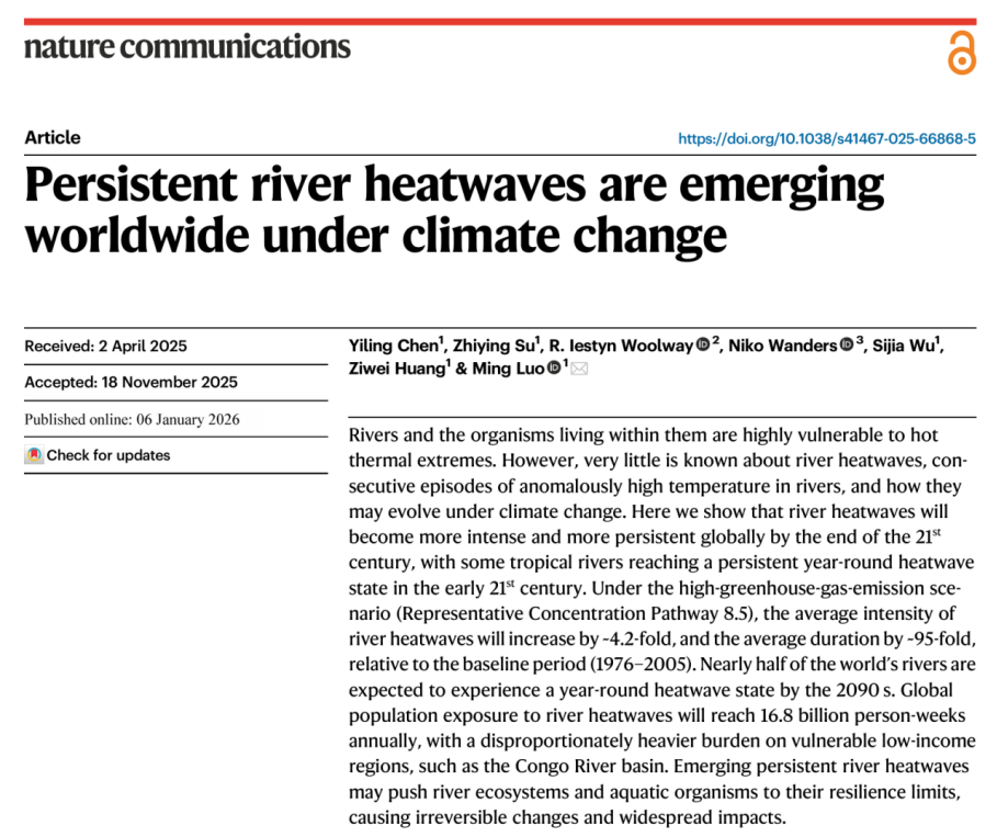 Chen, Y., Su, Z., Woolway, R. I., Wanders, N., Wu, S., Huang, Z., & Luo, M. (2026). Persistent river heatwaves are emerging worldwide under climate change. Nature Communications, 17(1), 94. https://doi.org/10.1038/s41467-025-66868-5