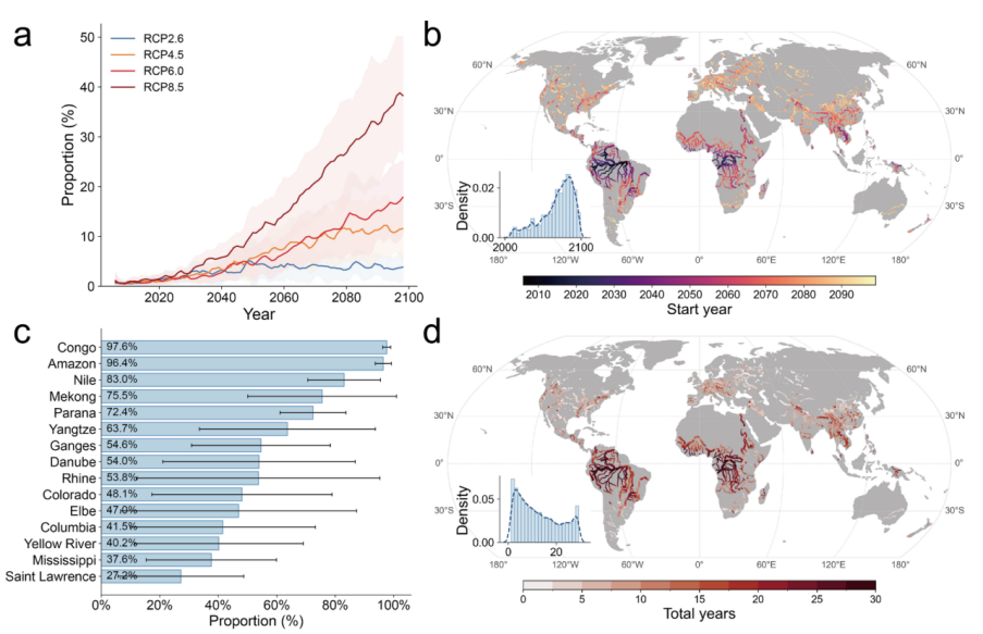 在高排放情景RCP 8.5情景下,本世纪末全球近一半的河流将出现全年持续性河流热浪(图2)。低纬度流域将面临最大风险,预计到本世纪末,刚果河流域超过97.6%的流域面积将出现持续性河流热浪。这种持续性河流热浪的出现意味着河流生态系统可能长期处于极端高温胁迫下,可能导致河流生态系统和水生生物达到其恢复能力的极限,甚至带来不可逆的生态变化。而在低排放情景(RCP 2.6)下,持续性河流热浪比例明显降低,表明减排措施对于缓解未来热浪风险具有重要作用。