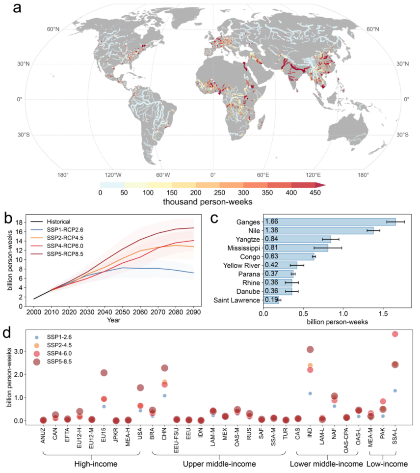 除了增加河流生态系统面临的热危害外,日益加剧的河流热浪还会对人类造成严重暴露风险。随着未来气候变暖的进一步加剧,全球将有更多人口暴露在河流热浪下,暴露量预计将以每十年约19亿人·周的速度上升,到2090年达到约168亿人·周。低收入国家及人口密度高地区将面临更大风险(图3)