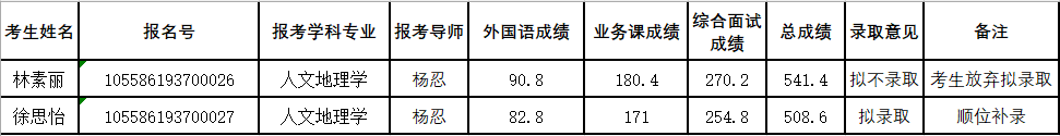 根据《中山大学地理科学与规划学院2026年博士研究生招生简章》《中山大学地理科学与规划学院2026年“申请-考核”制博士研究生综合考核结果公示(第一批)》以及学校相关规定,考生林素丽 (考生编号: 105586193700026)放弃拟录取资格,按报考导师的总成绩从高分到低分拟递补录取考生徐思怡(考生编号:105586193700027)。经学院研究生招生工作领导小组审议,现予以公示如下: